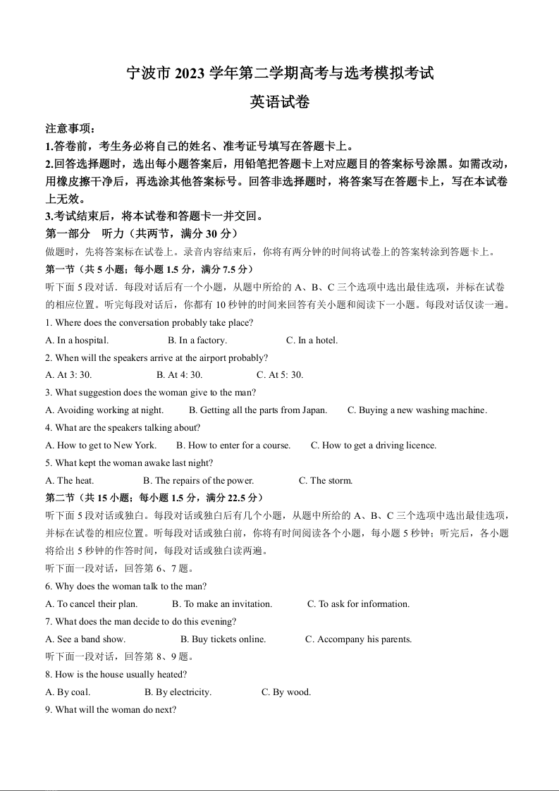 浙江省宁波市2024届高三下学期二模英语