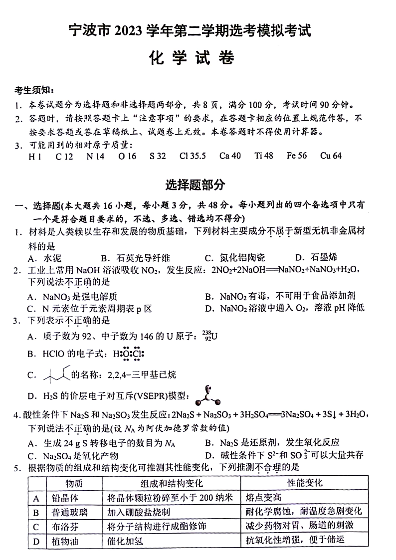 浙江省宁波市2024届高三下学期二模化学+答案