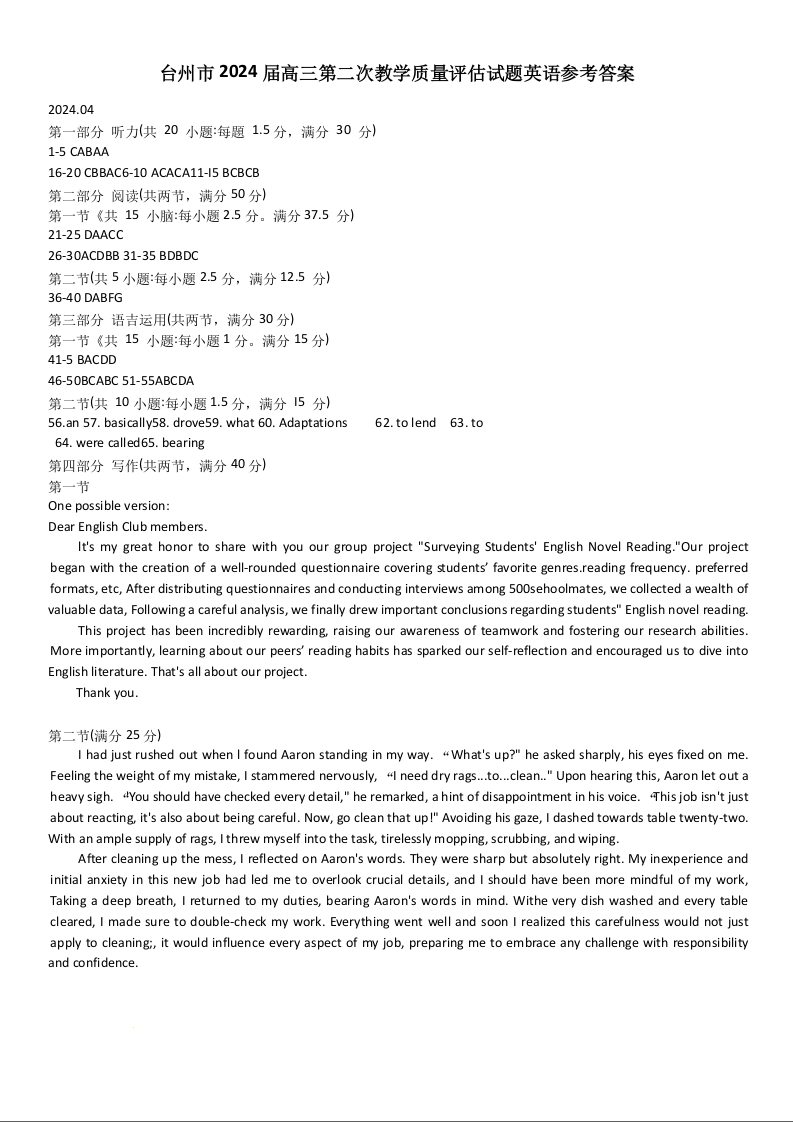 浙江省台州市2024届高三下学期4月二模英语答案