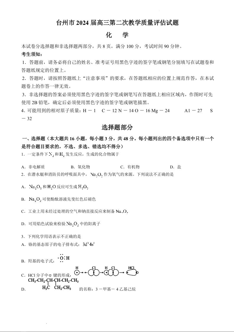 浙江省台州市2024届高三下学期4月二模化学+答案
