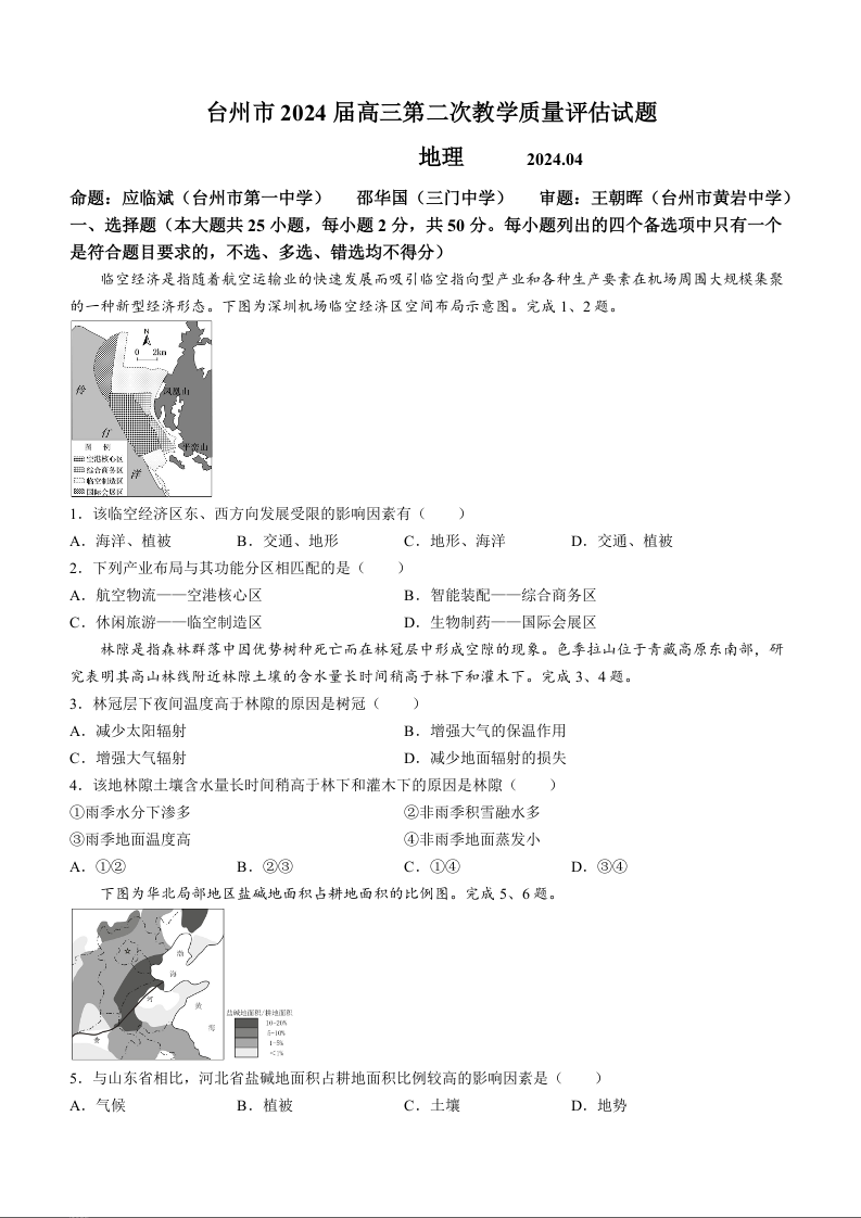 浙江省台州市2024届高三下学期4月二模地理+答案