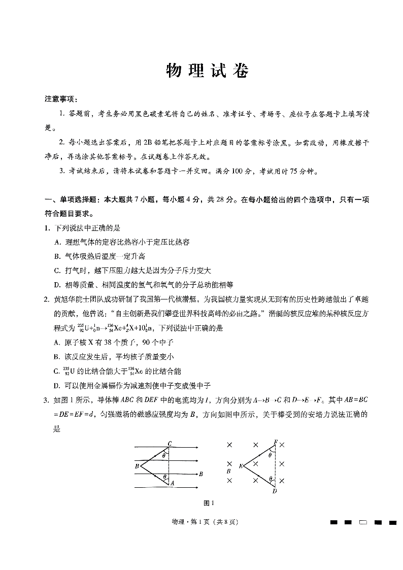 重庆市巴蜀中学2024届高考适应性月考卷(八)物理