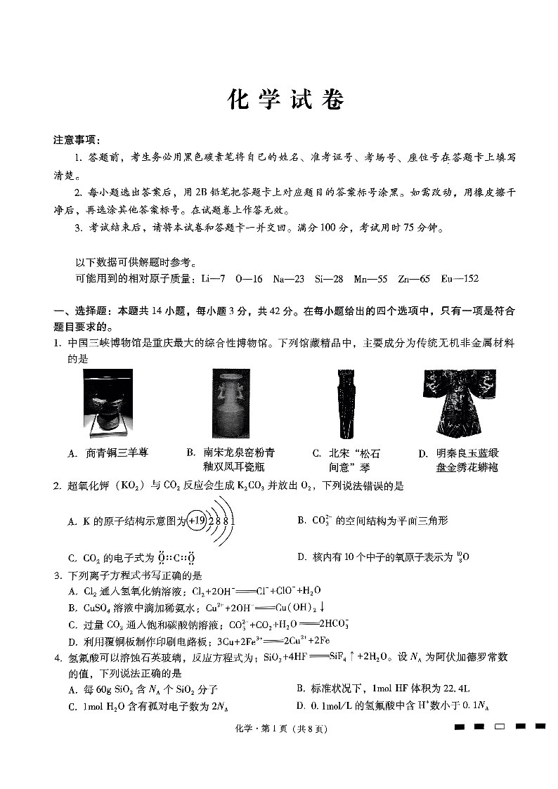 重庆市巴蜀中学2024届高考适应性月考卷(八)化学
