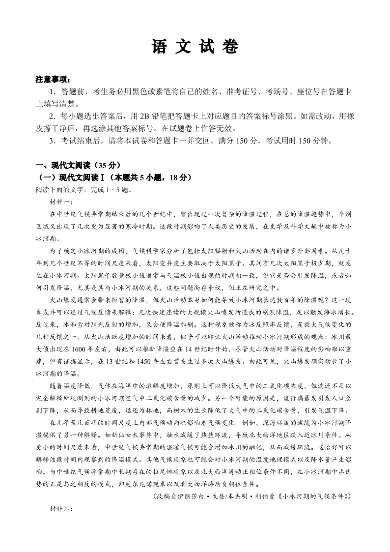 重庆市巴蜀中学2024届高考适应性月考卷(九)语文