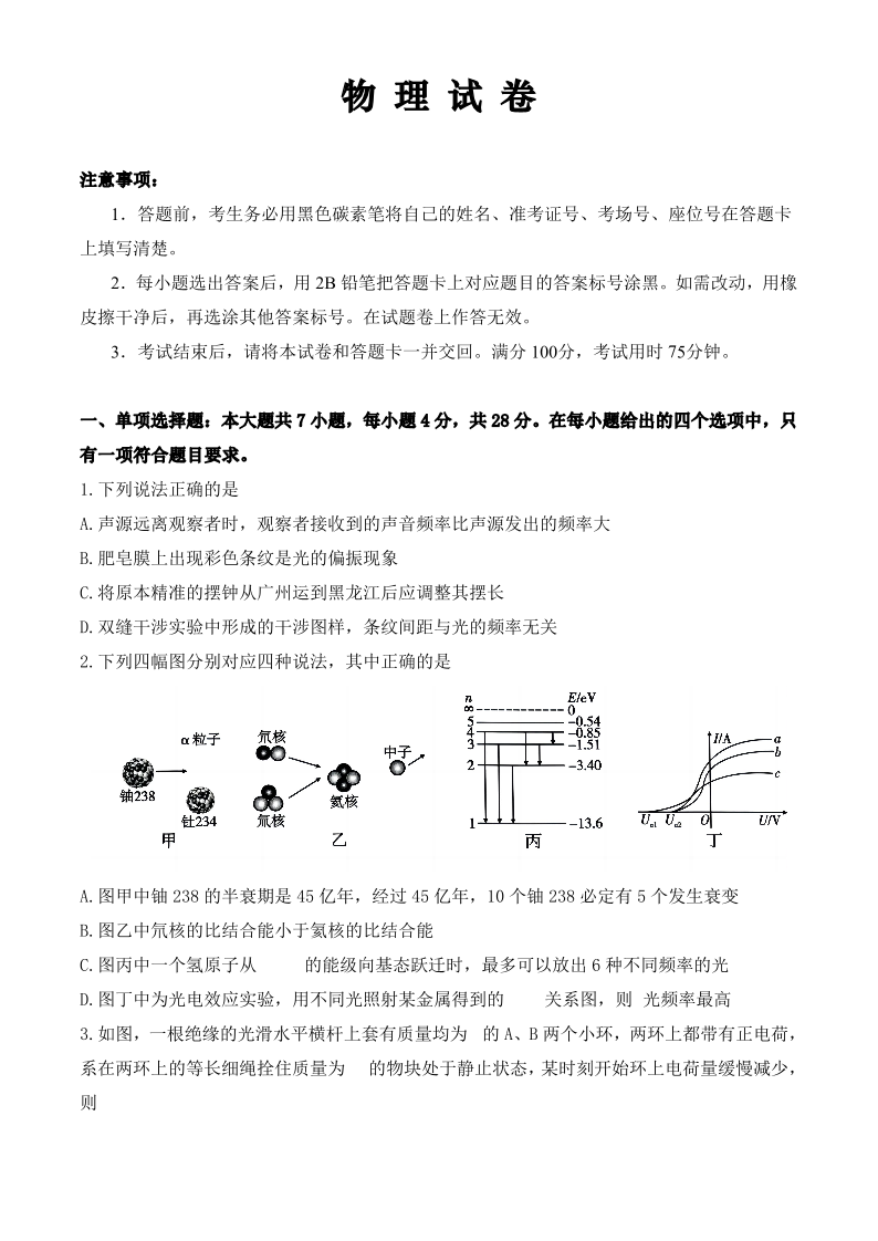 重庆市巴蜀中学2024届高考适应性月考卷(九)物理