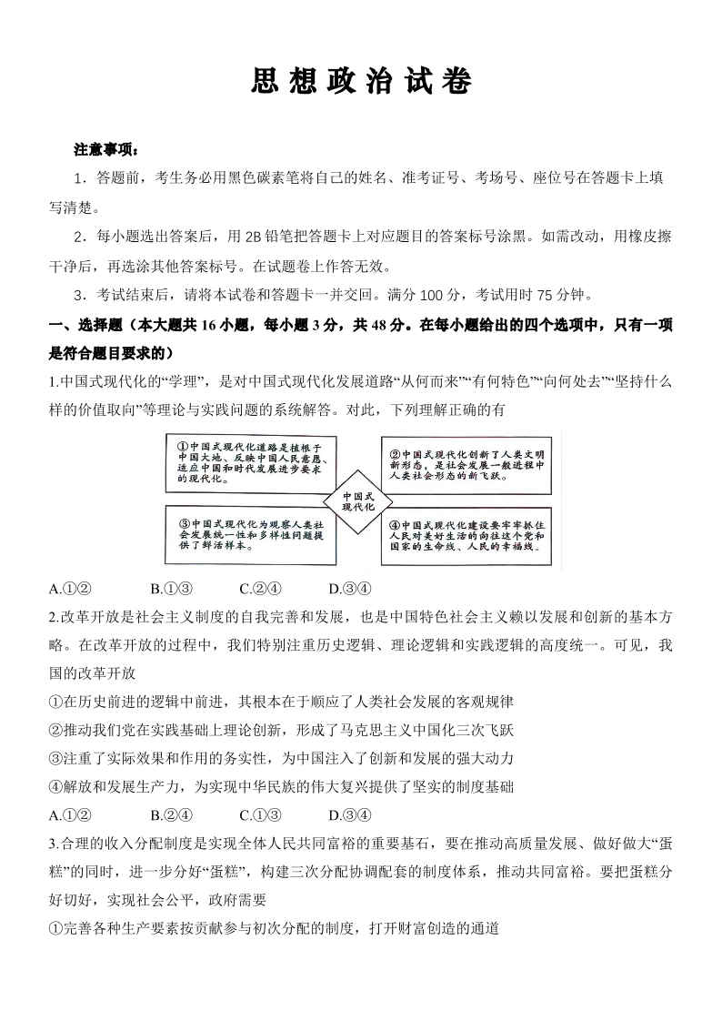 重庆市巴蜀中学2024届高考适应性月考卷(九)政治