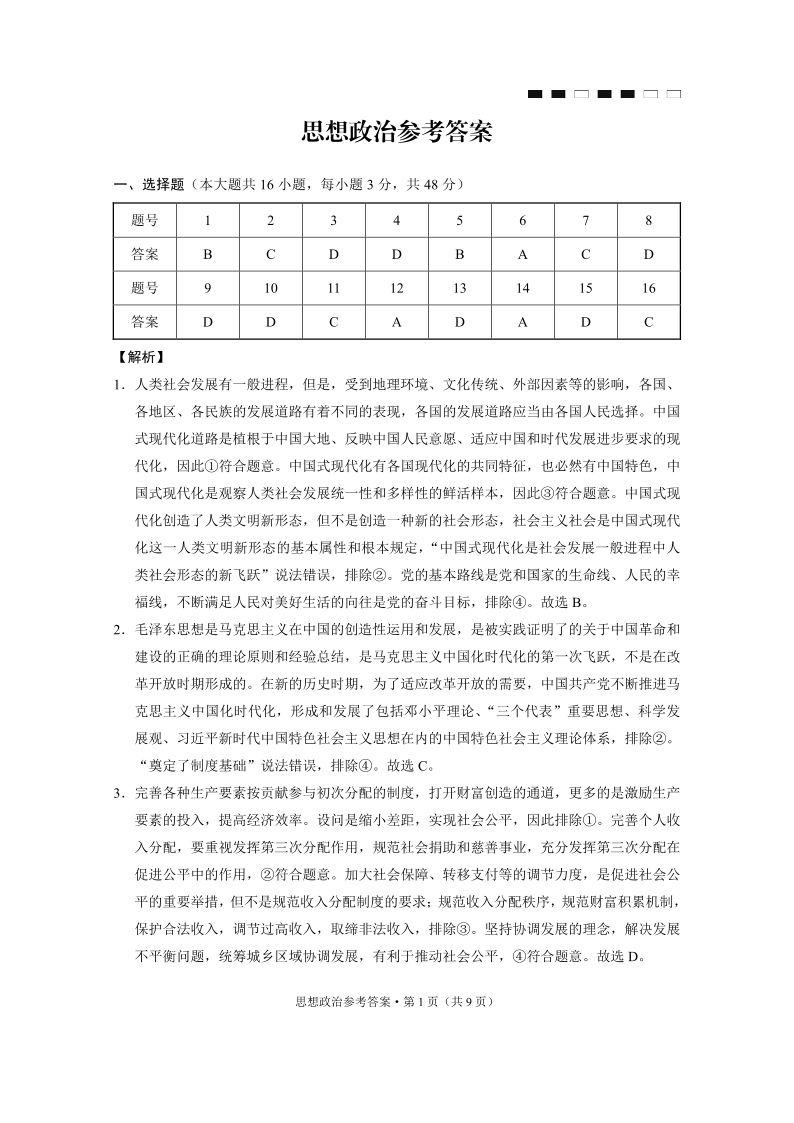 重庆市巴蜀中学2024届高考适应性月考卷(九)政治答案