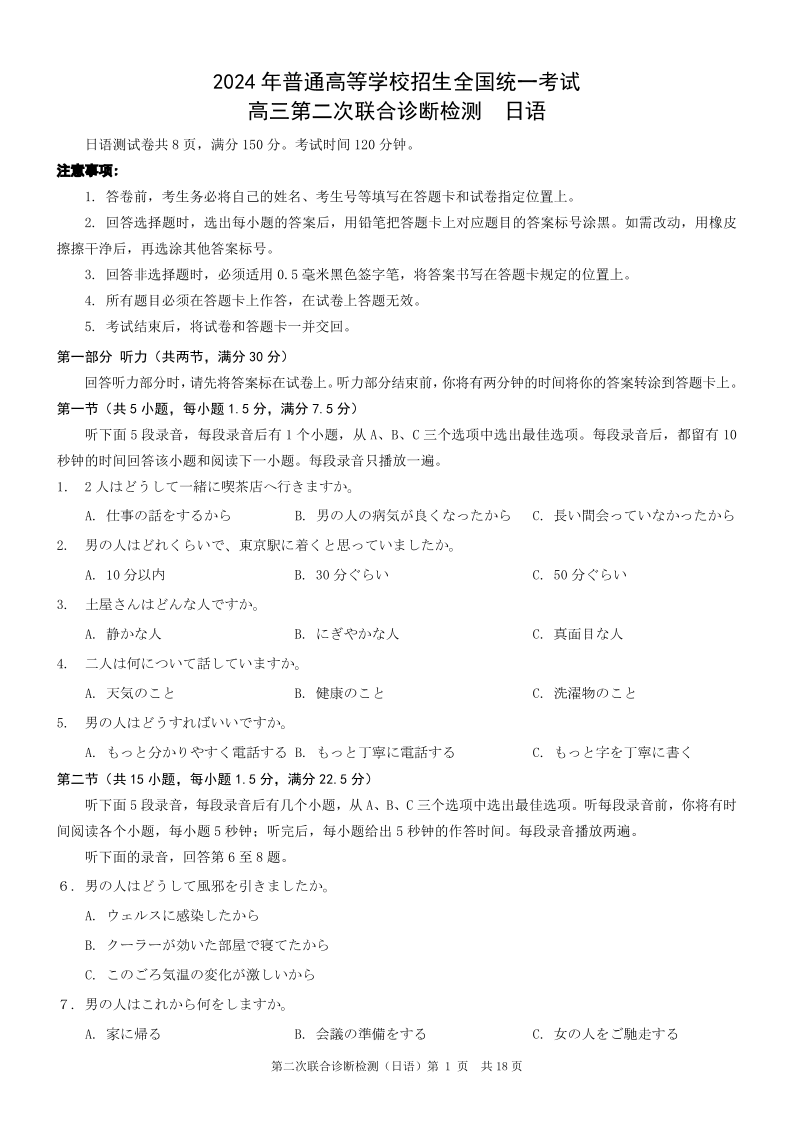 重庆康德二诊2024年普通高等学校招生全国统一考试高三第二次联合诊断检(重庆二诊)日语