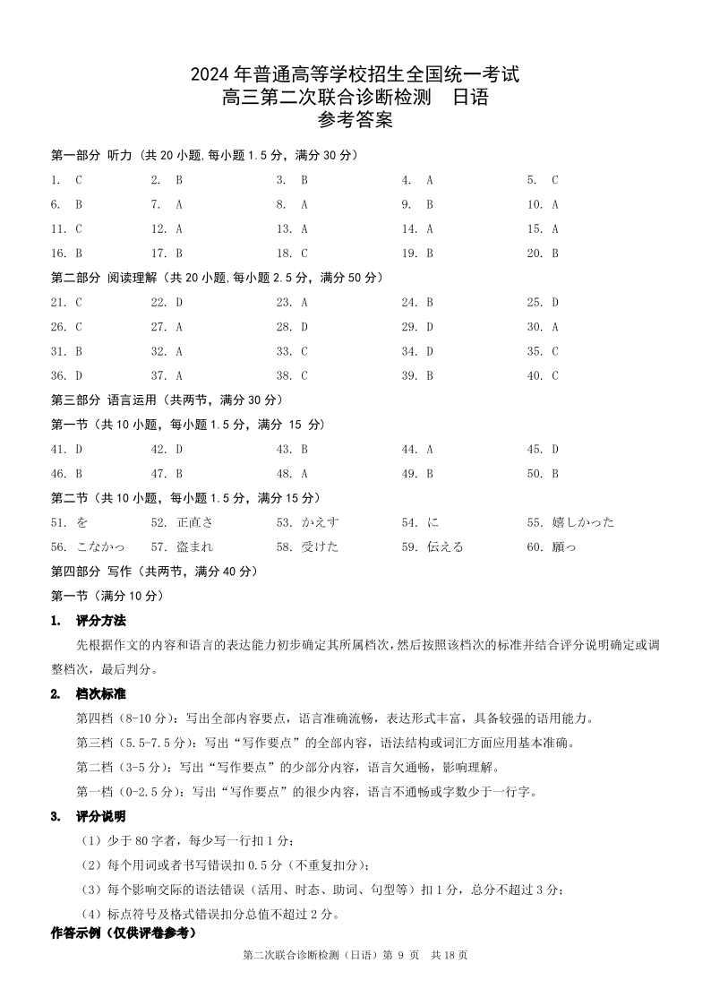 重庆康德二诊2024年普通高等学校招生全国统一考试高三第二次联合诊断检(重庆二诊)日语答案