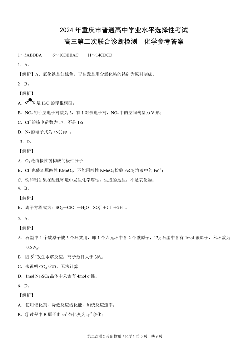重庆康德二诊2024年普通高等学校招生全国统一考试高三第二次联合诊断检(重庆二诊)化学答案
