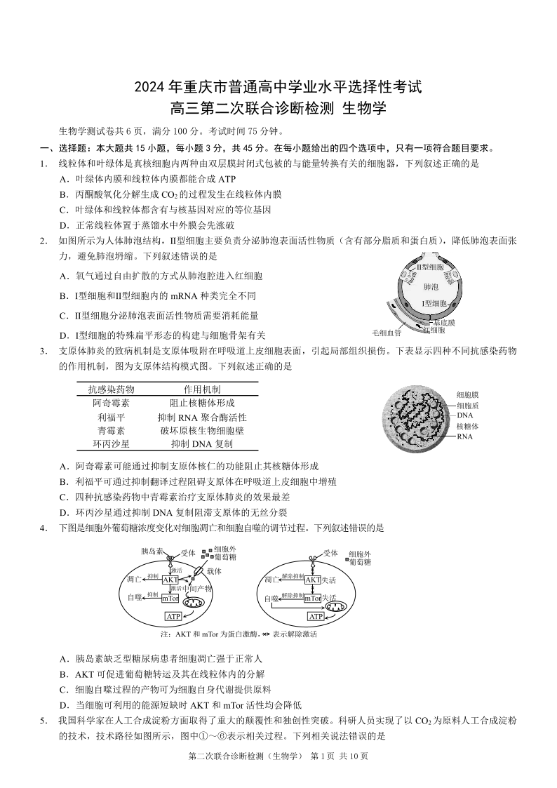 重庆康德二诊2024年普通高等学校招生全国统一考试高三第二次联合诊断检(重庆二诊)生物