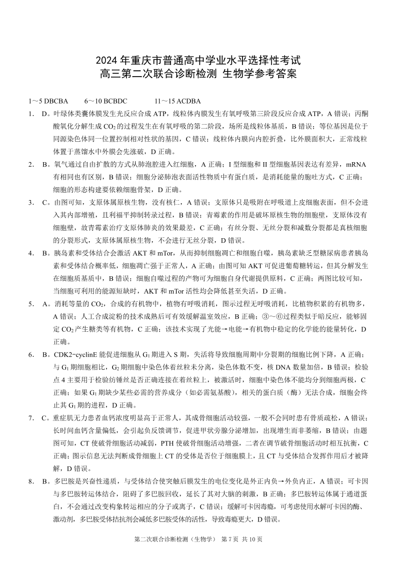 重庆康德二诊2024年普通高等学校招生全国统一考试高三第二次联合诊断检(重庆二诊)生物答案