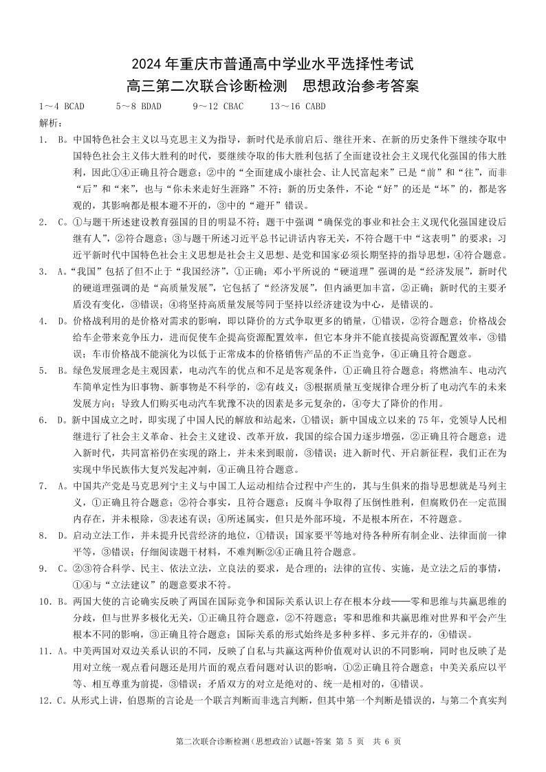 重庆康德二诊2024年普通高等学校招生全国统一考试高三第二次联合诊断检(重庆二诊)政治答案