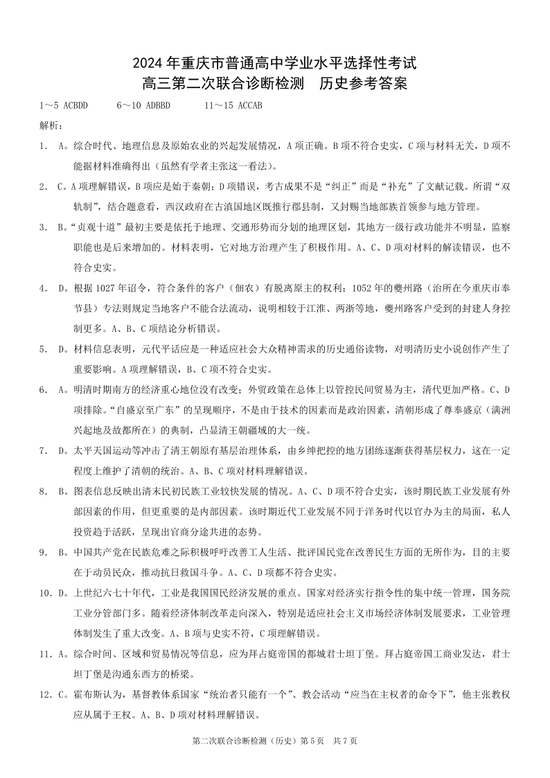 重庆康德二诊2024年普通高等学校招生全国统一考试高三第二次联合诊断检(重庆二诊)历史答案