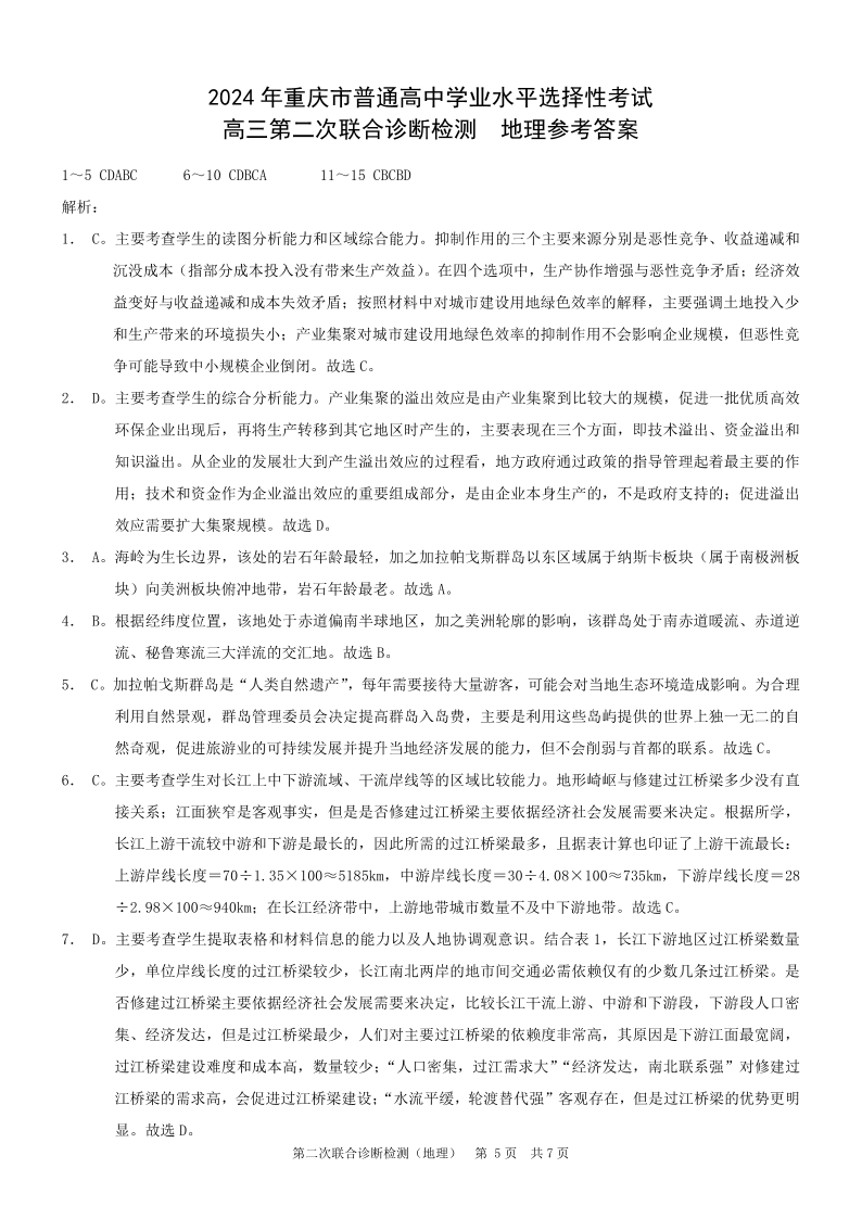重庆康德二诊2024年普通高等学校招生全国统一考试高三第二次联合诊断检(重庆二诊)地理答案