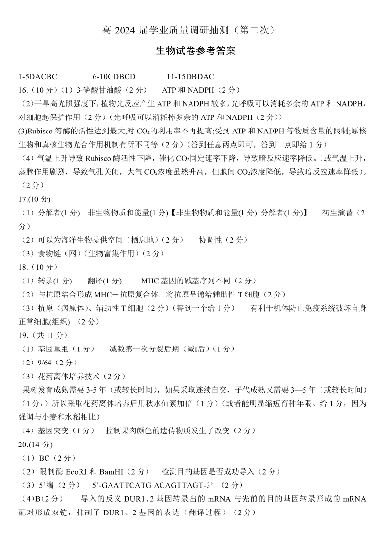 重庆市主城九龙坡区高2024届学业质量调研抽测(第二次)生物答案
