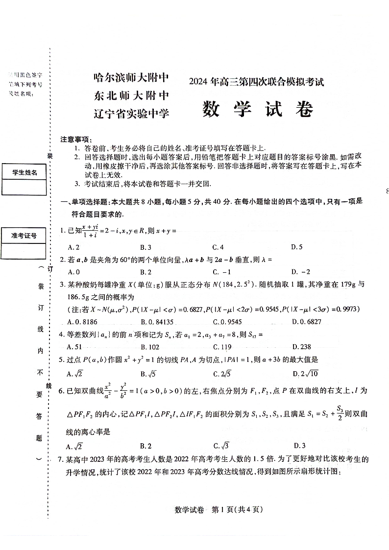 东北三省三所百强校2024届高三下学期第四次联合模拟考数学