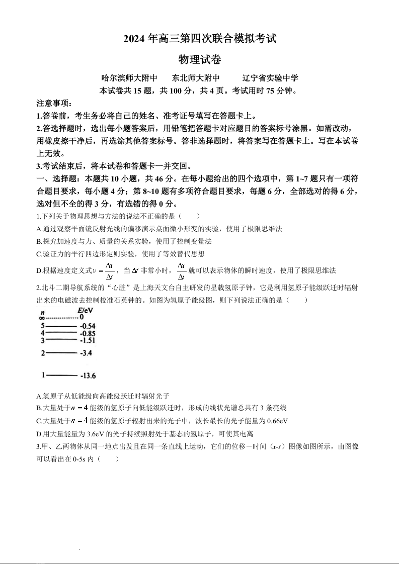 东北三省三所百强校2024届高三下学期第四次联合模拟考物理