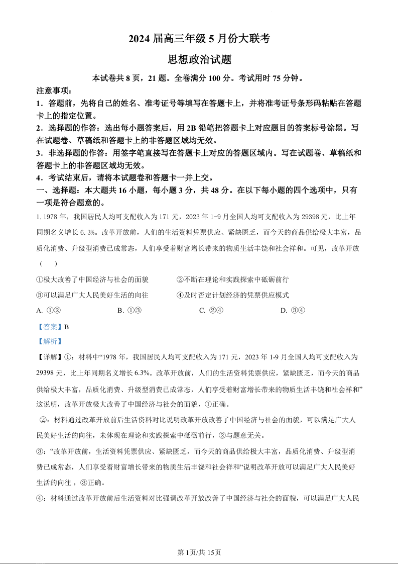 东北三省三所百强校2024届高三下学期第四次联合模拟考政治(精品解析版)