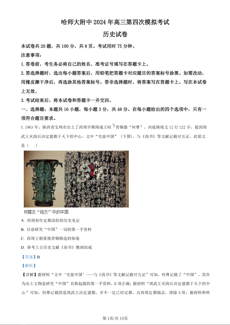东北三省三所百强校2024届高三下学期第四次联合模拟考历史(精品解析版)