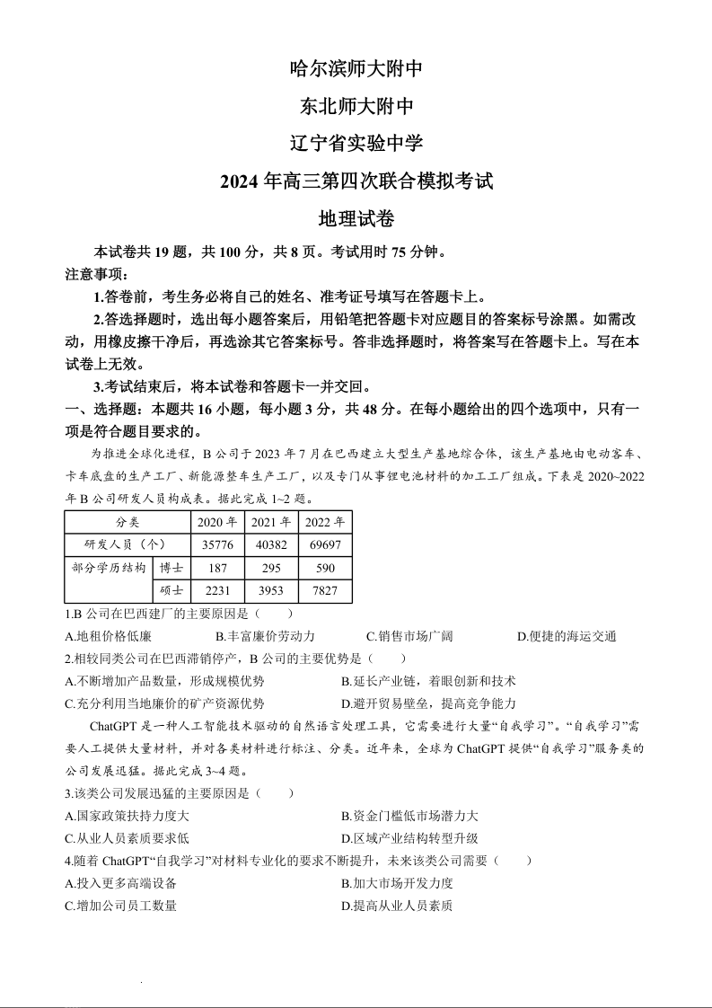东北三省三所百强校2024届高三下学期第四次联合模拟考地理
