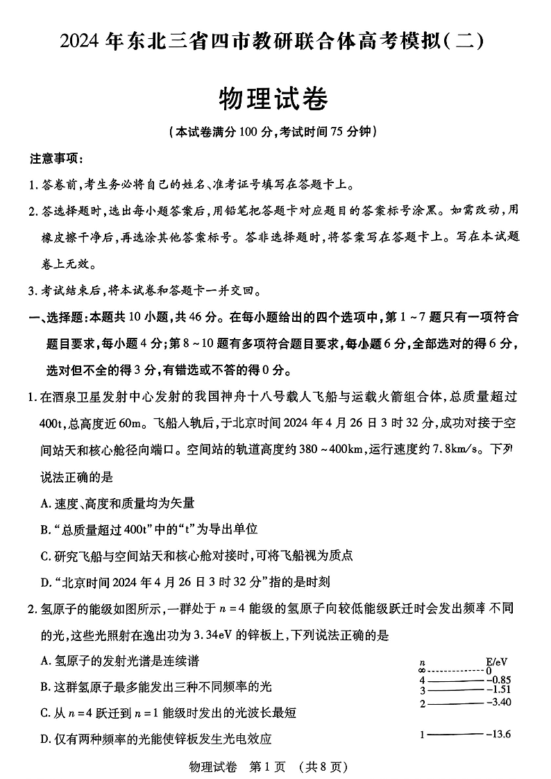 东北三省四市教研联合体2024届高三下学期二模考试物理