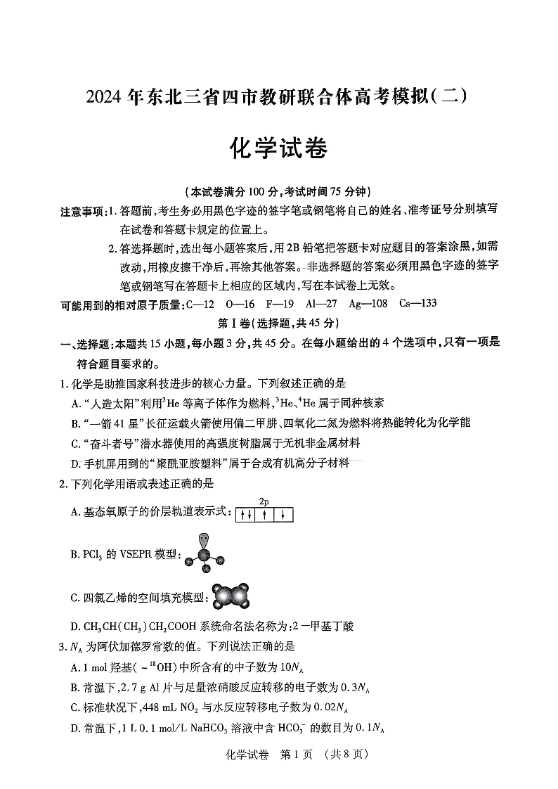 东北三省四市教研联合体2024届高三下学期二模考试化学+答案