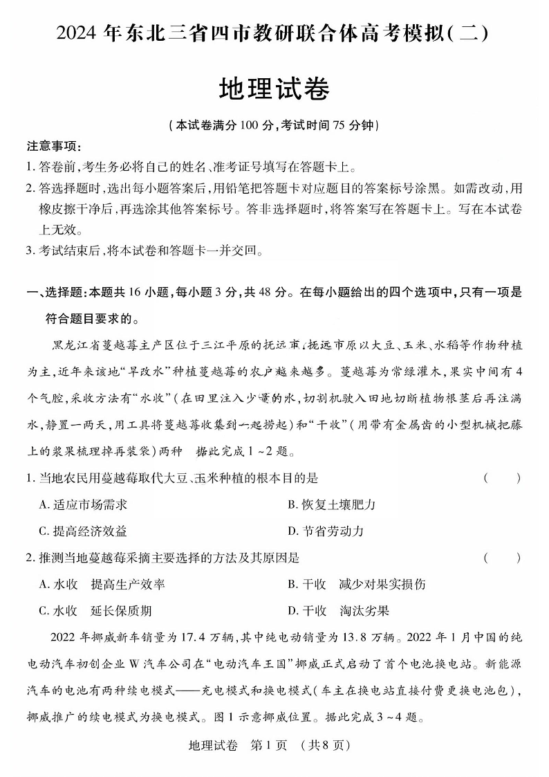 东北三省四市教研联合体2024届高三下学期二模考试地理