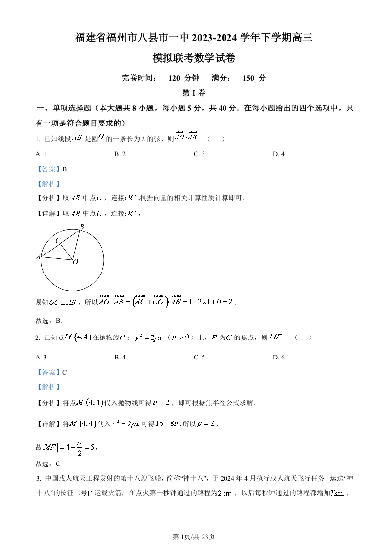 福建省福州市八县市一中2024届高三下学期5月模拟考数学(精品解析版)