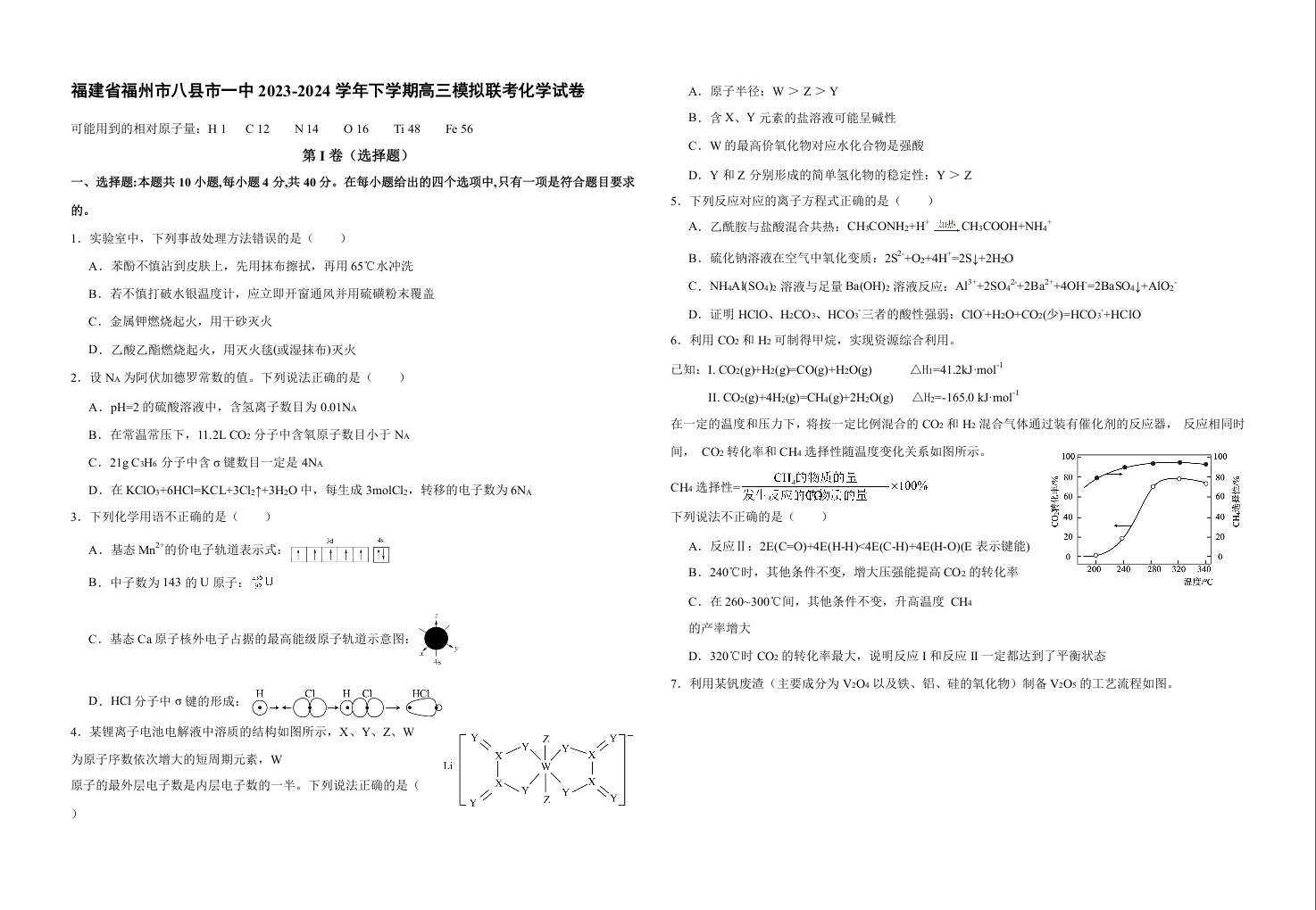 福建省福州市八县市一中2024届高三下学期5月模拟考化学+答案