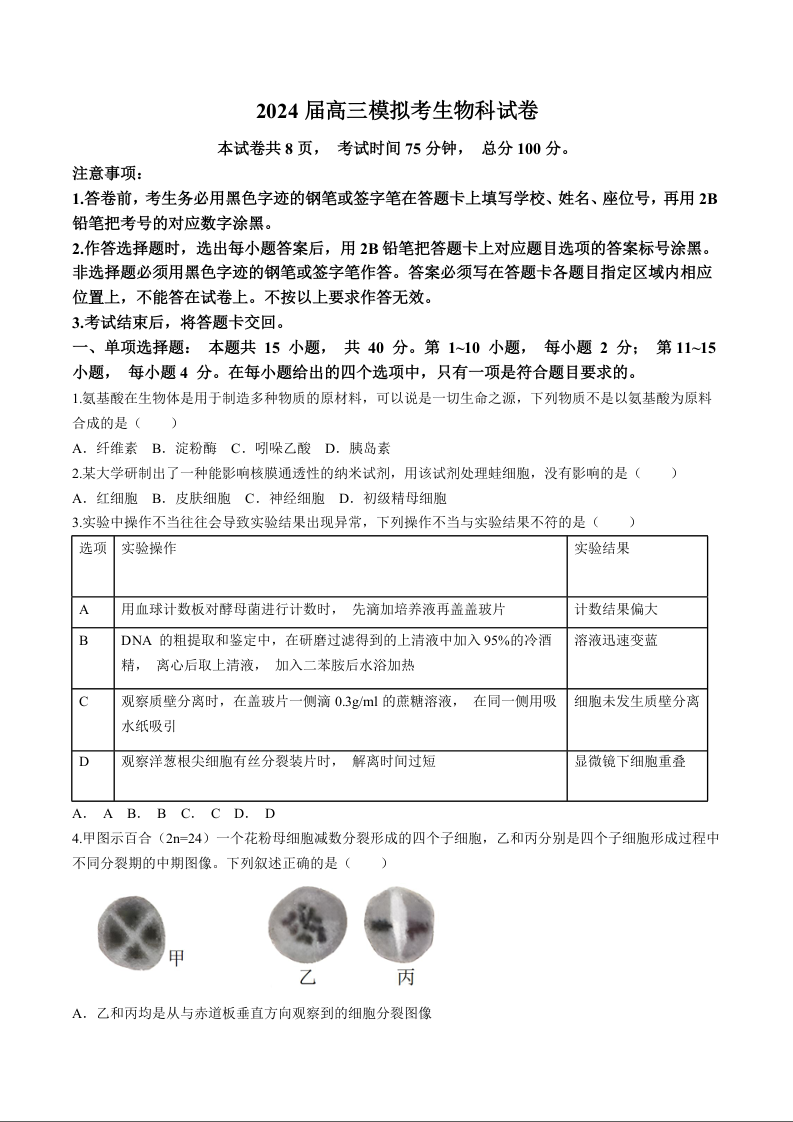 福建省福州市八县市一中2024届高三下学期5月模拟考生物+答案