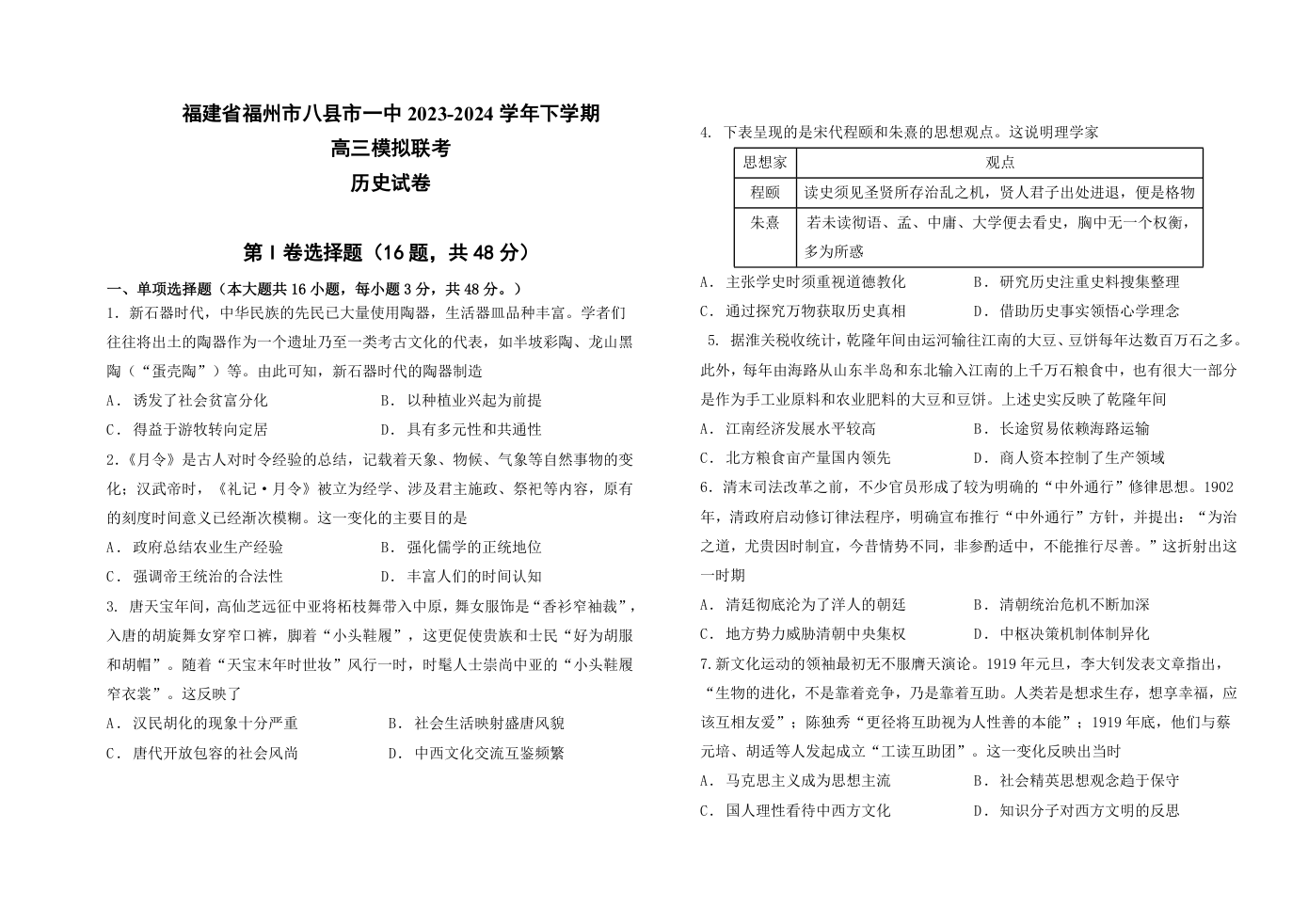 福建省福州市八县市一中2024届高三下学期5月模拟考历史+答案