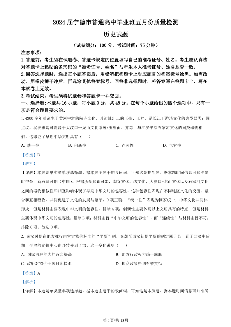 福建省宁德市2024届高三下学期5月质量检测(三模)历史(精品解析版)