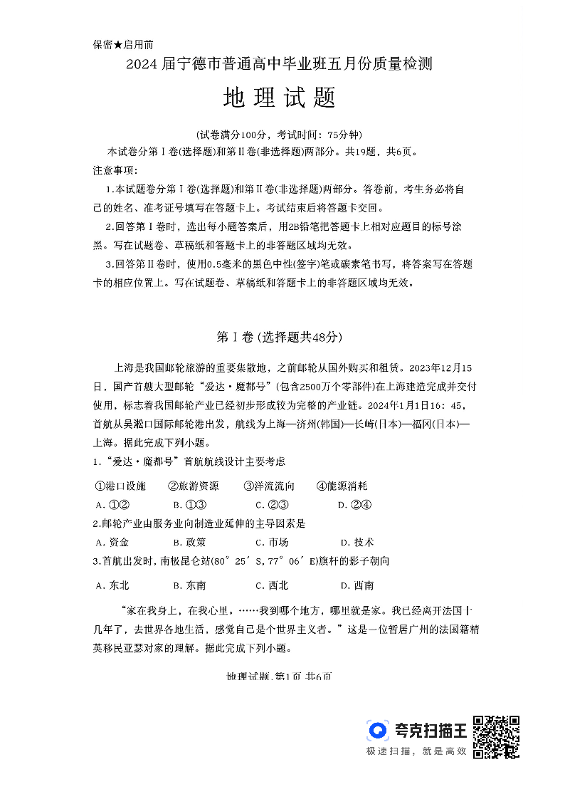 福建省宁德市2024届高三下学期5月质量检测(三模)地理+答案