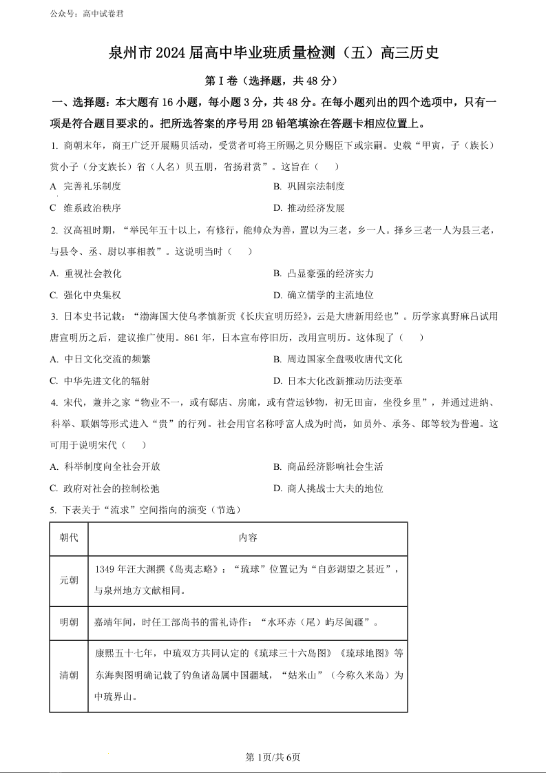 福建省泉州市2024届高三质量检测(五)历史(原卷版)