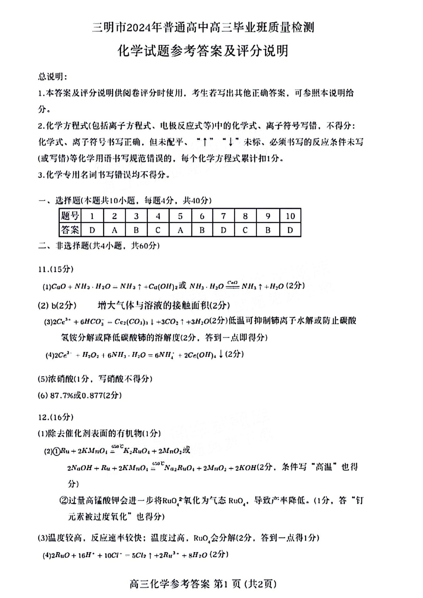 福建省三明市2024届高三下学期三模化学答案