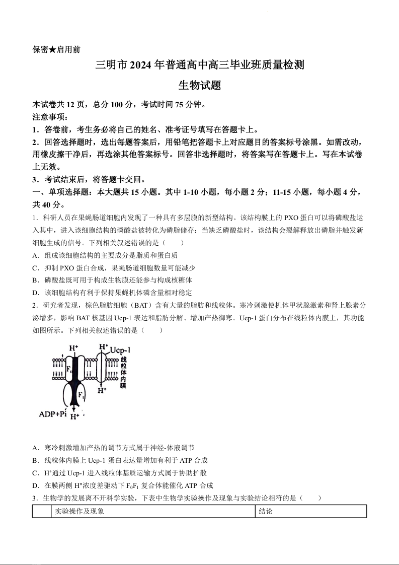 福建省三明市2024届高三下学期三模生物+答案
