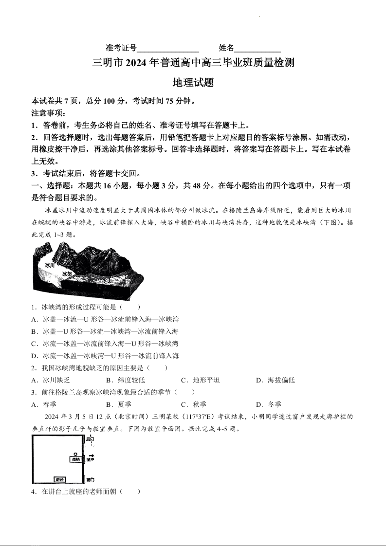 福建省三明市2024届高三下学期三模地理+答案