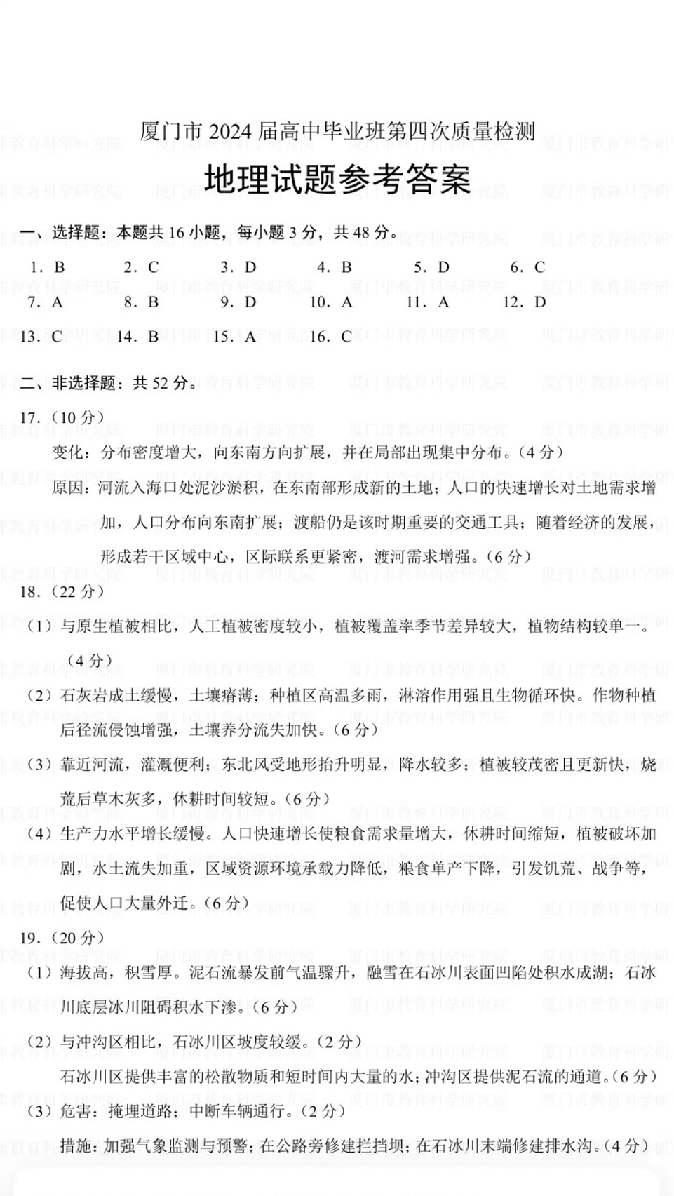 福建省厦门市2024届高三下学期联考模拟预测地理答案