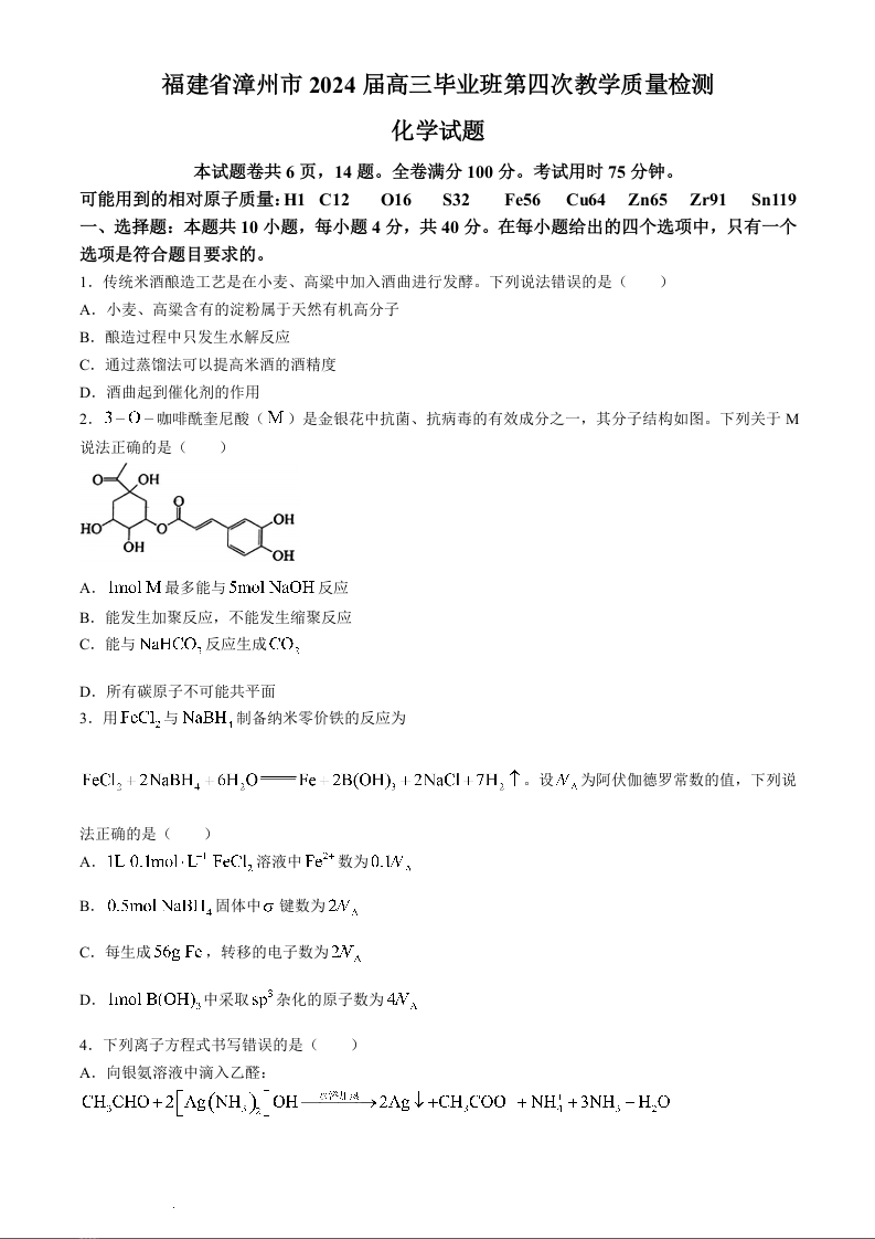 福建省漳州市2024届高三第四次教学质量检测化学+答案