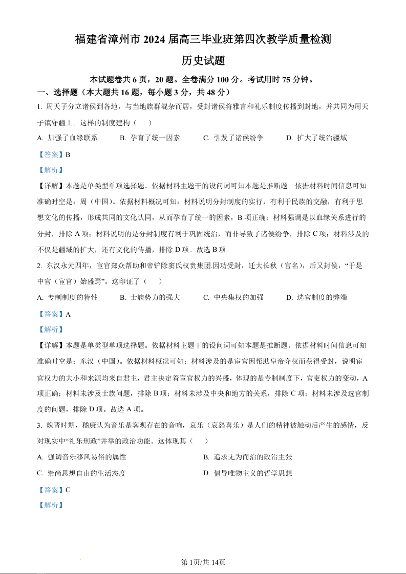 福建省漳州市2024届高三第四次教学质量检测历史(精品解析版)