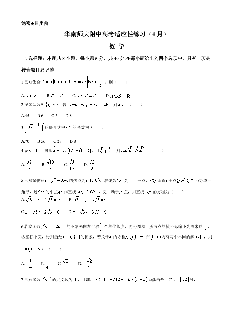 广东省华南师范大学附属中学2024届高三4月高考适应性练习数学+答案
