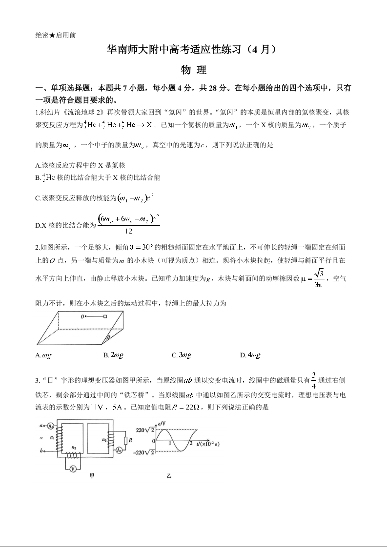 广东省华南师范大学附属中学2024届高三4月高考适应性练习物理+答案