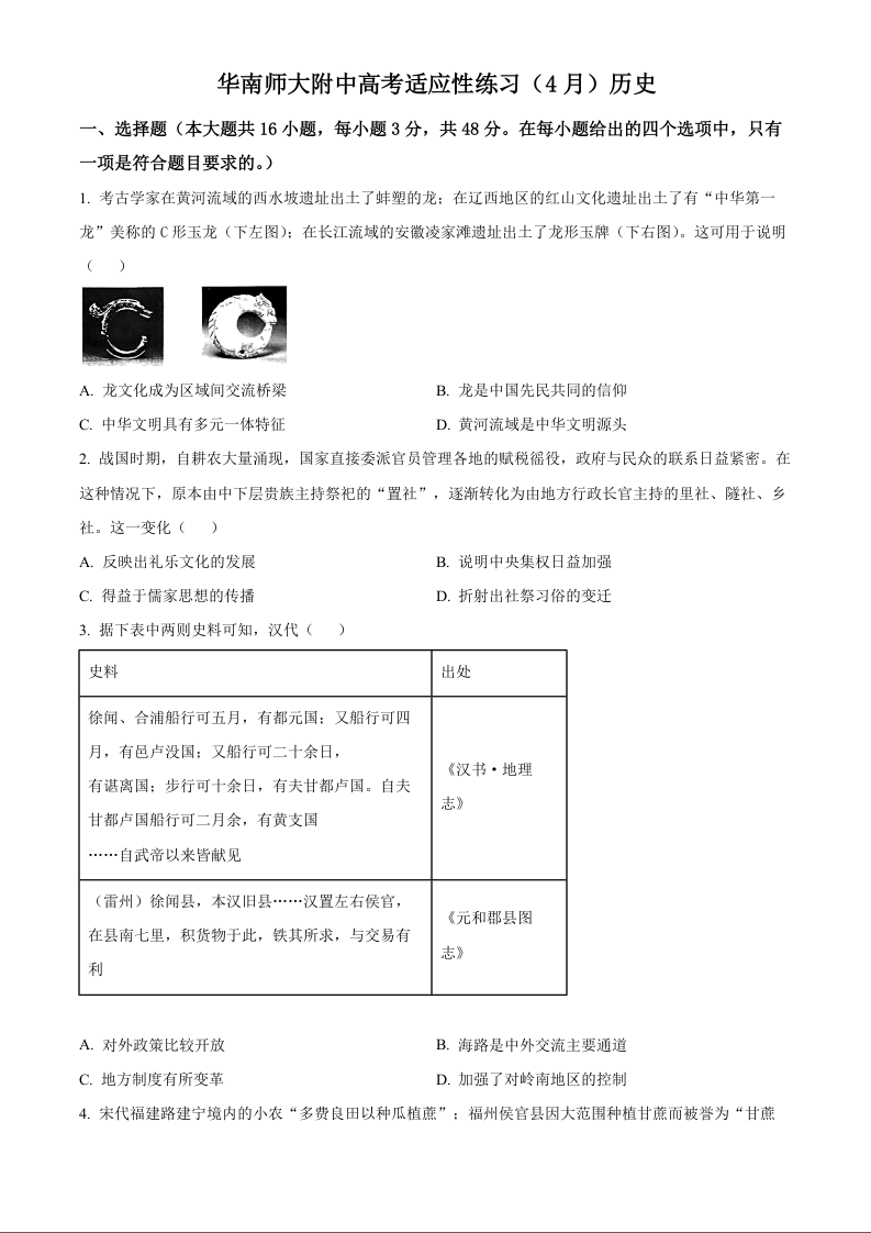 广东省华南师范大学附属中学2024届高三4月高考适应性练习历史+答案