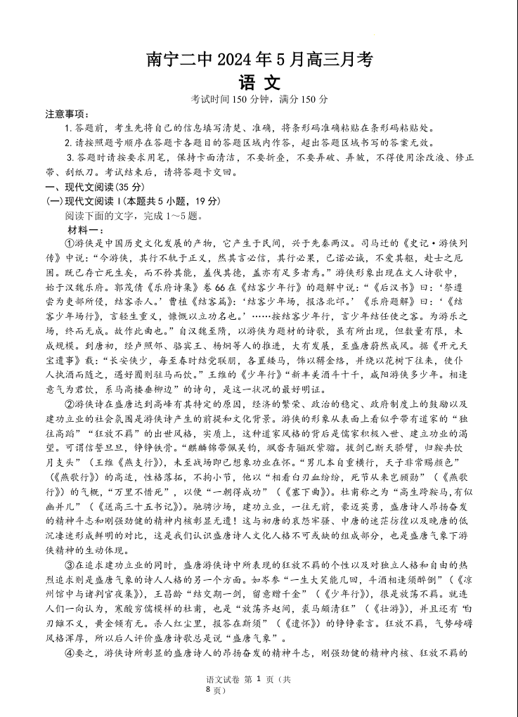 广西南宁市第二中学2024届高三下学期5月月考语文