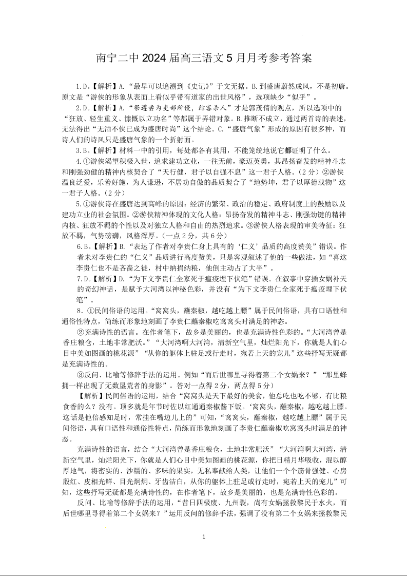 广西南宁市第二中学2024届高三下学期5月月考语文答案