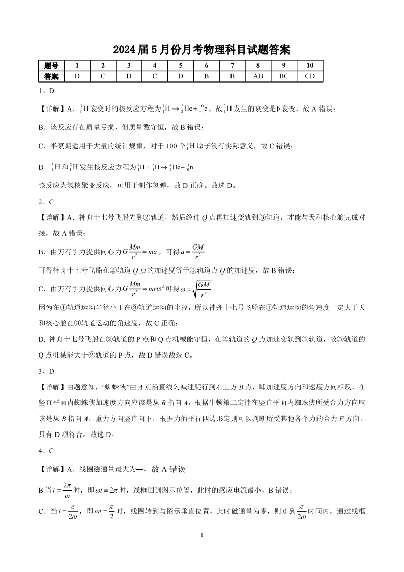 广西南宁市第二中学2024届高三下学期5月月考物理答案