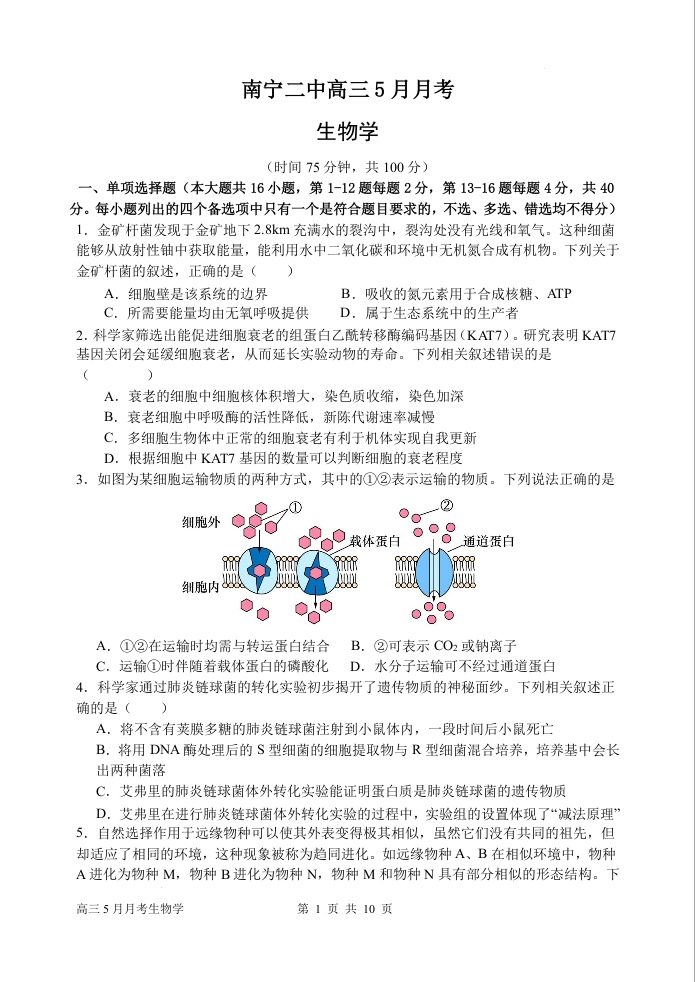 广西南宁市第二中学2024届高三下学期5月月考生物