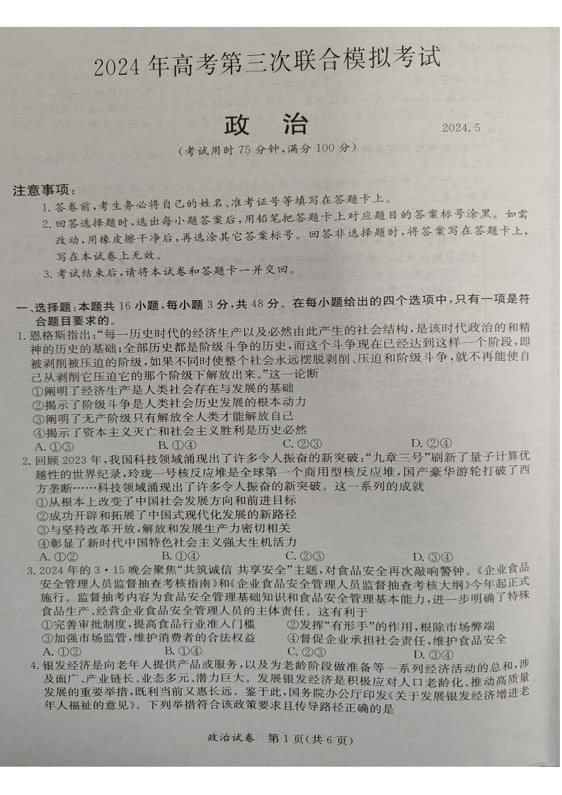 广西省桂林、来宾、北海2024届高三三模政治