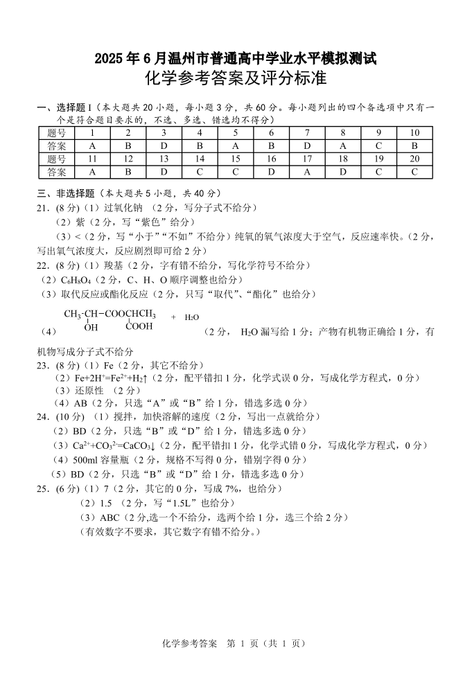 浙江省温州市2025年6月高一学业水平模拟考试化学答案